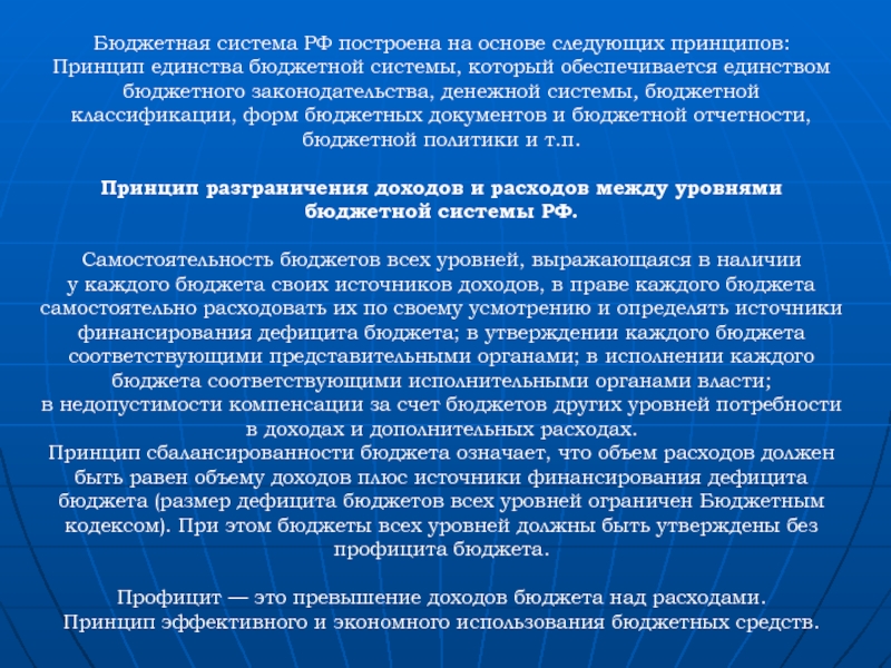 Бюджетная система РФ построена на основе следующих принципов: Принцип единства бюджетной системы, который обеспечивается единством бюджетного законодательства,