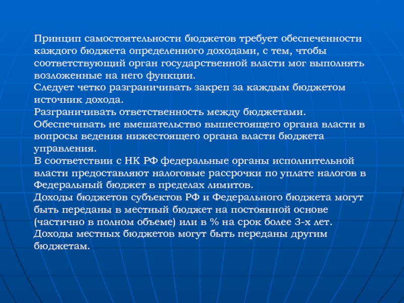 Слайд 13Принцип самостоятельности бюджетов требует обеспеченности каждого бюджета определенного доходами, с