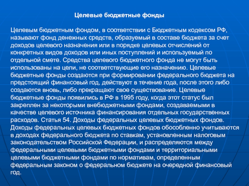 Целевым бюджетным фондом, в соответствии с Бюджетным кодексом РФ, называют фонд денежных средств, образуемый в составе бюджета за счет доходов целевого назначения или в порядке целевых отчислений от конкретных видов доходов или иных поступлений и используемый по отдельной смете. Средства целевого бюджетного фонда не могут быть использованы на цели, не соответствующие его назначению. Целевые бюджетные фонды создаются при формировании федерального бюджета на предстоящий финансовый год, действуют в течение года, после этого либо создаются вновь, либо прекращают свое существование. Целевые бюджетные фонды появились в РФ в 1995 году, когда этот статус был закреплен за некоторыми внебюджетными фондами, создаваемыми в качестве целевого источника финансирования отдельных государственных расходов. Статья 54. Доходы федеральных целевых бюджетных фондов. Доходы федеральных целевых бюджетных фондов обособленно учитываются в доходах федерального бюджета по ставкам, установленным налоговым законодательством Российской Федерации, и распределяются между федеральными целевыми бюджетными фондами и территориальными целевыми бюджетными фондами по нормативам, определенным федеральным законом о федеральном бюджете на очередной финансовый год.