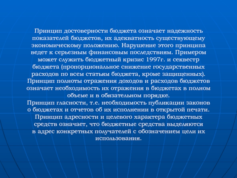 Принцип достоверности бюджета означает надежность показателей бюджетов, их адекватность существующему экономическому положению. Нарушение этого принципа ведет к серьезным
