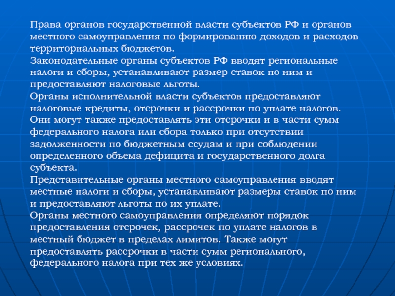 Права органов государственной власти субъектов РФ и органов местного самоуправления по формированию доходов и расходов территориальных бюджетов.Законодательные