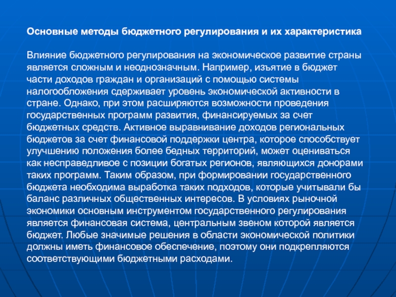 Основные методы бюджетного регулирования и их характеристика Влияние бюджетного регулирования на экономическое развитие страны является сложным и