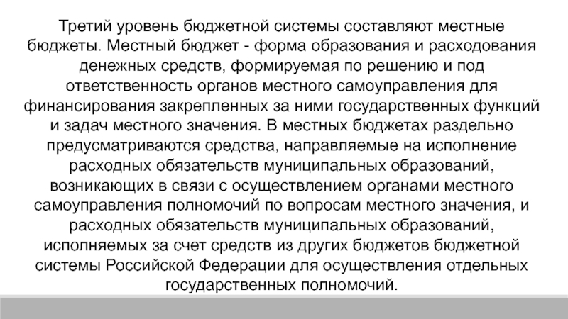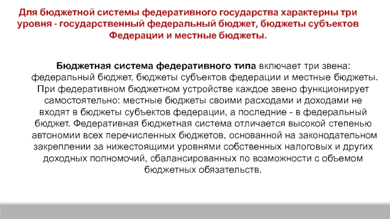 Для бюджетной системы федеративного государства характерны три уровня - государственный федеральный бюджет, бюджеты субъектов Федерации и местные бюджеты.