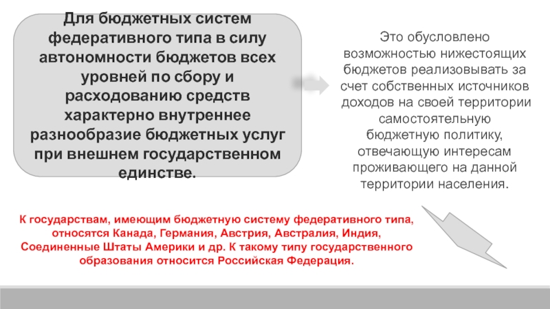 К государствам, имеющим бюджетную систему федеративного типа, относятся Канада, Германия, Австрия, Австралия, Индия, Соединенные Штаты Америки и др. К такому типу государственного образования относится Российская Федерация.