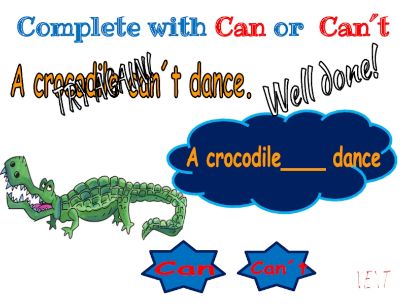 Can´t Can A crocodile____ danceA crocodile can´t dance.Well done!NEXTTRY AGAIN!Complete with Can or Can´t