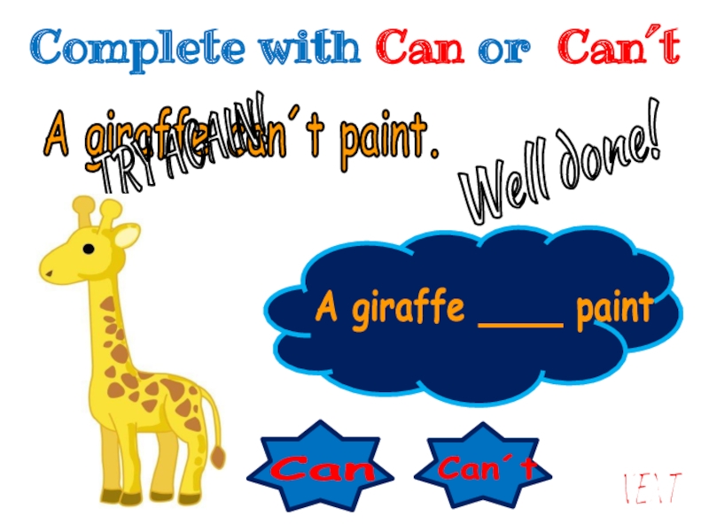 Can´t Can A giraffe ____ paintA giraffe can´t paint.Well done!NEXTTRY AGAIN!Complete with Can or Can´t