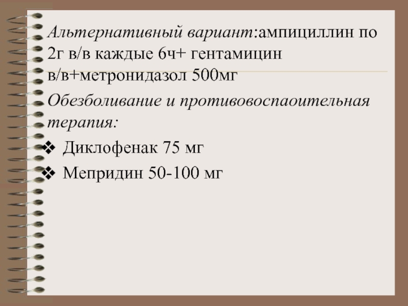 Слайд 22Альтернативный вариант:ампициллин по 2г в/в каждые 6ч+ гентамицин в/в+метронидазол 500мг