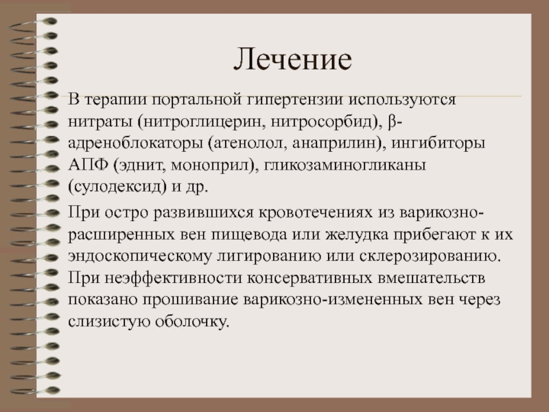 В терапии портальной гипертензии используются нитраты (нитроглицерин, нитросорбид), β-адреноблокаторы (атенолол,
