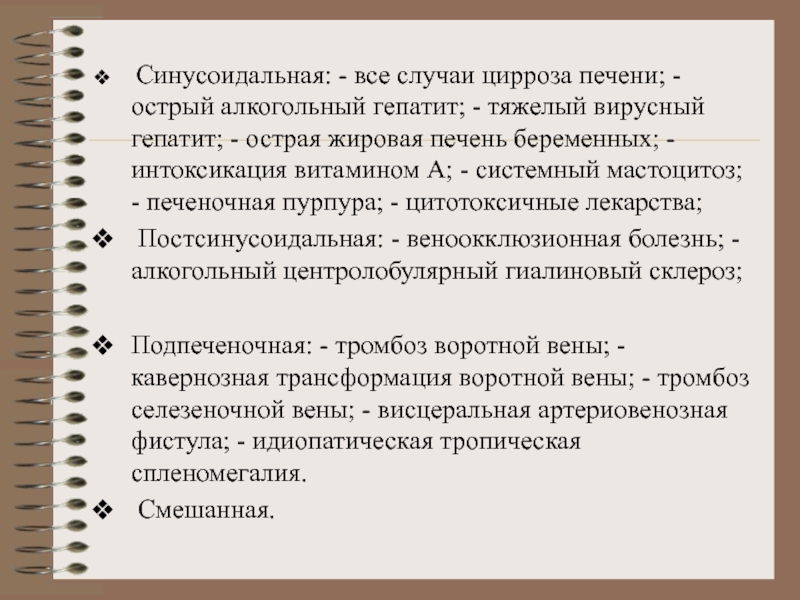 Пресинусоидальная: - болезнь Рандю-Ослера; - врожденный фиброз печени; - тромбоз ветвей портальной вены (тяжелый бактериальный холангит, злокачественные новообразования); - первичный билиарный холангит, токсичных веществ (медь, мышьяк, 6-меркаптопурин);