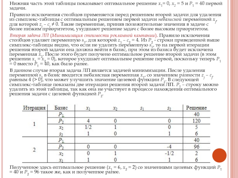 Вторая задача ЛП (Минимизация стоимости рекламной кампании). Правило исключения столбцов удаляет переменную s1, для которой z1 – c2 = 4. Из Р2 - строки приведенной выше симплекс-таблицы видно, что если не удалить переменную s1, то на первой итерации решения второй задачи она должна войти в базис, при этом из базиса будет исключена переменная х2. После этого будет получено оптимальное решение второй задачи (в этом решении x1 = х2 = 0), которое ухудшает оптимальное решение первой, поскольку теперь P1 = 0 вместо P1 = 40, как было ранее.