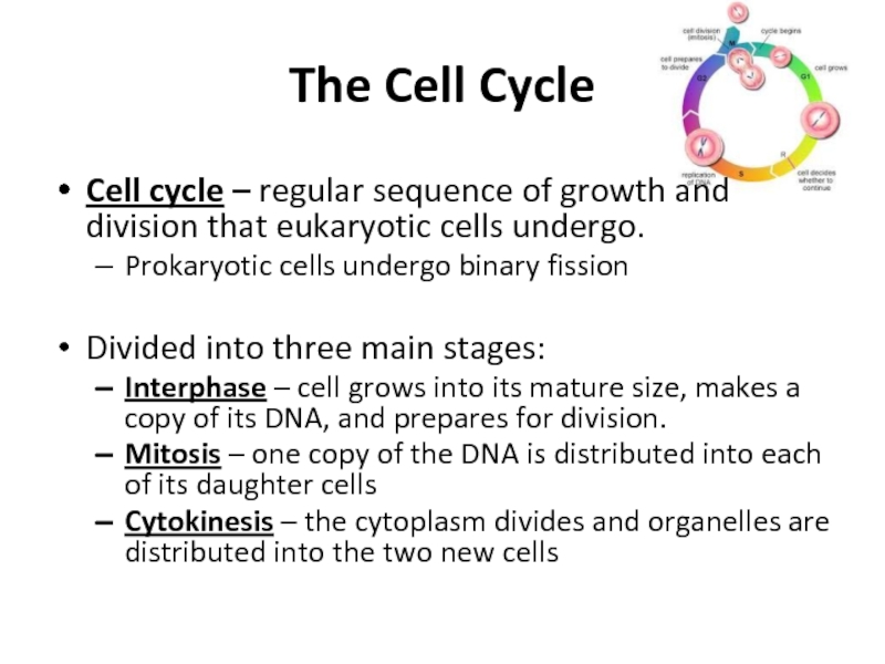 three main stages:Interphase – cell grows into its mature size, makes a copy of its DNA, and prepares for division.