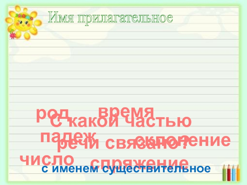 Имя прилагательноепадежродчислосклонениеспряжениевремяС какой частью речи связано?с именем существительное