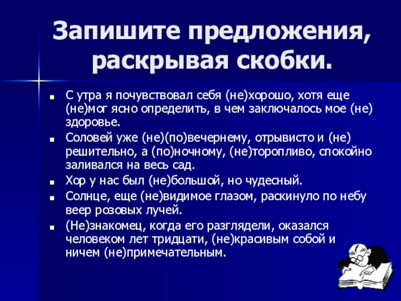 (не)(по)вечернему, отрывисто и (не)решительно, а (по)ночному, (не)торопливо, спокойно заливался на весь сад.