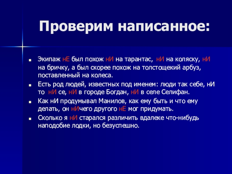 Как нИ продумывал Манилов, как ему быть и что ему делать, он нИчего другого нЕ мог придумать.