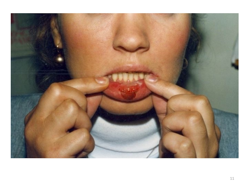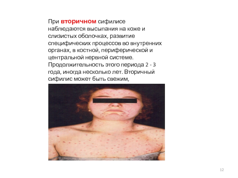 Слайд 12При вторичном сифилисе наблюдаются высыпания на коже и слизистых оболочках,