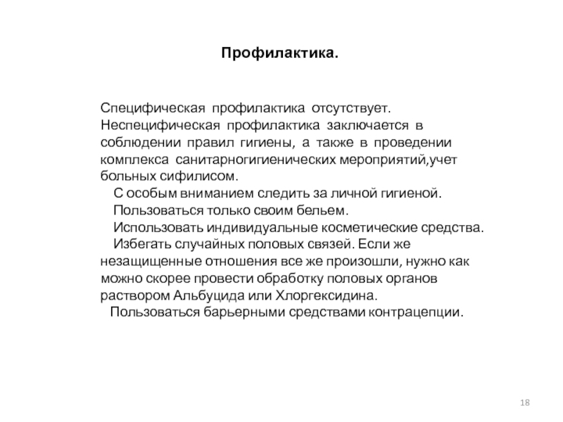 Неспецифическая профилактика заключается в соблюдении правил гигиены, а также в проведении комплекса санитарногигиенических мероприятий,учет больных сифилисом.