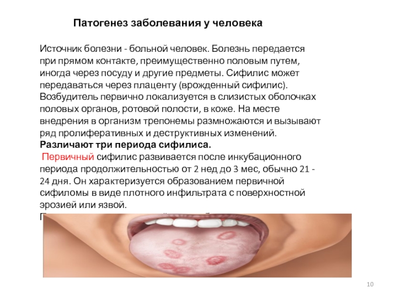 прямом контакте, преимущественно половым путем, иногда через посуду и другие предметы. Сифилис может передаваться через плаценту (врожденный сифилис). Возбудитель первично локализуется в слизистых оболочках половых органов, ротовой полости, в коже. На месте внедрения в организм трепонемы размножаются и вызывают ряд пролиферативных и деструктивных изменений.