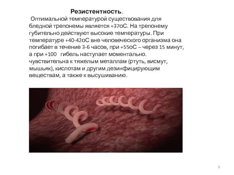 трепонемы является +37оС. На трепонему губительно действуют высокие температуры. При температуре +40-42оС вне человеческого организма она погибает в течение 3-6 часов, при +55оС – через 15 минут, а при +100 гибель наступает моментально.