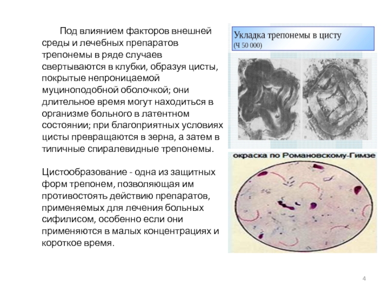 Цистообразование - одна из защитных форм трепонем, позволяющая им противостоять действию препаратов, применяемых для лечения больных сифилисом, особенно если они применяются в малых концентрациях и короткое время.
