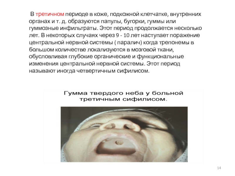 Этот период продолжается несколько лет. В некоторых случаях через 9 - 10 лет наступает поражение центральной нервной системы ( паралич) когда трепонемы в большом количестве локализуются в мозговой ткани, обусловливая глубокие органические и функциональные изменения центральной нервной системы. Этот период называют иногда четвертичным сифилисом.