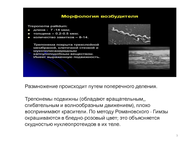 Трепонемы подвижны (обладают вращательным,, сгибательным и волнообразным движением), плохо воспринимают красители. По методу Романовского - Гимзы окрашиваются в бледно-розовый цвет; это объясняется скудностью нуклеопротеидов в их теле.
