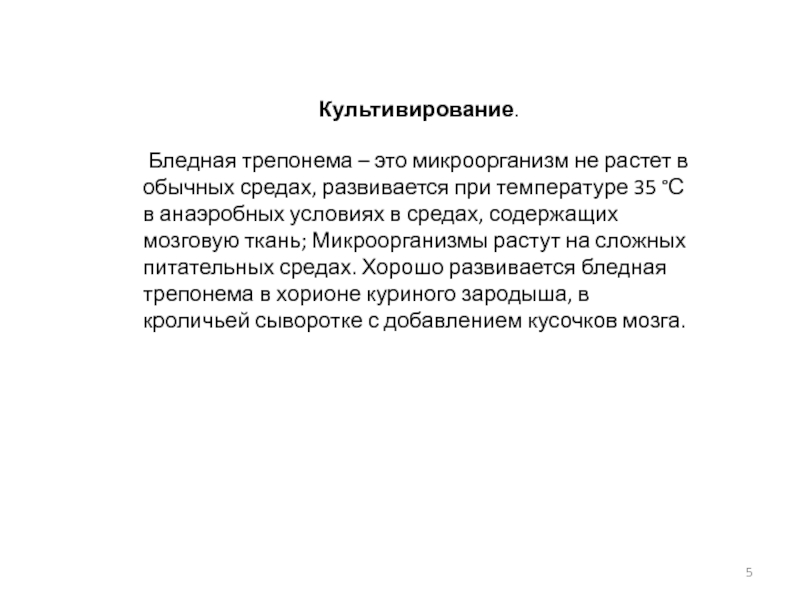 трепонема – это микроорганизм не растет в обычных средах, развивается при температуре 35 °С в анаэробных условиях в средах, содержащих мозговую ткань; Микроорганизмы растут на сложных питательных средах. Хорошо развивается бледная трепонема в хорионе куриного зародыша, в кроличьей сыворотке с добавлением кусочков мозга.
