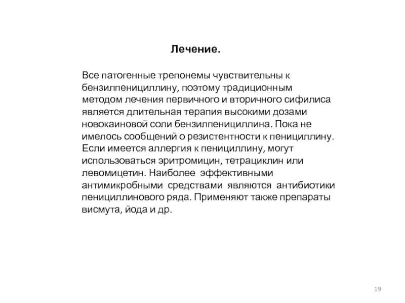 трепонемы чувствительны к бензилпенициллину, поэтому традиционным методом лечения первичного и вторичного сифилиса является длительная терапия высокими дозами новокаиновой соли бензилпенициллина. Пока не имелось сообщений о резистентности к пенициллину. Если имеется аллергия к пенициллину, могут использоваться эритромицин, тетрациклин или левомицетин. Наиболее эффективными антимикробными средствами являются антибиотики