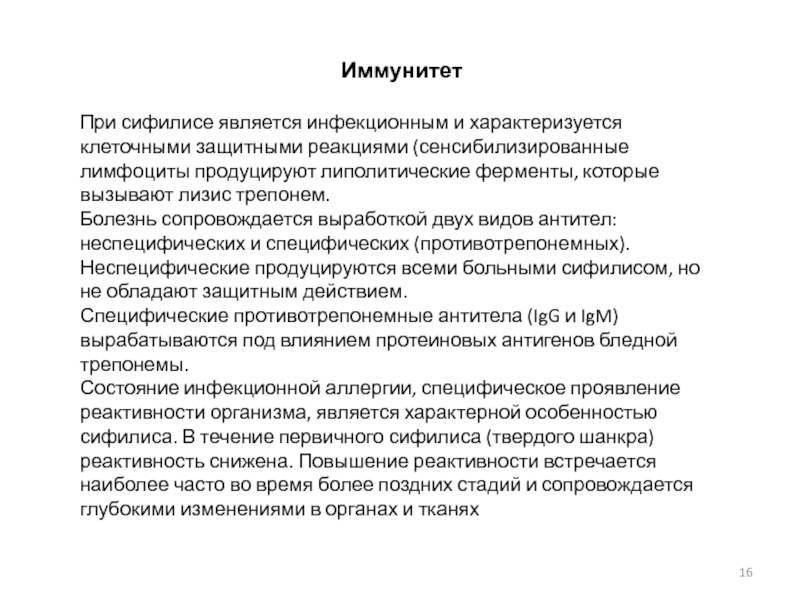 При сифилисе является инфекционным и характеризуется клеточными защитными реакциями (сенсибилизированные лимфоциты продуцируют липолитические ферменты, которые вызывают лизис трепонем.