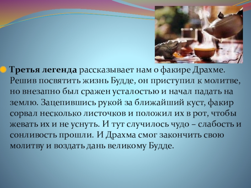 Слайд 4Третья легенда рассказывает нам о факире Драхме. Решив посвятить жизнь