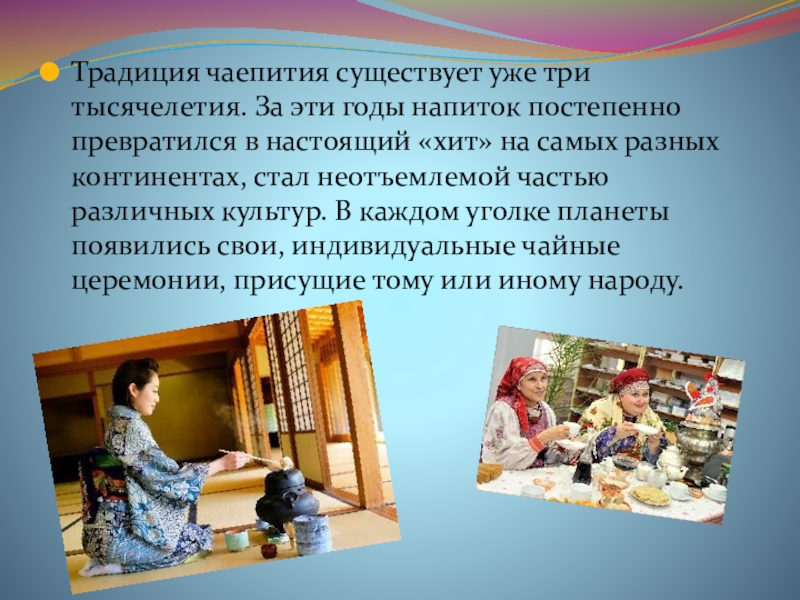 Слайд 7Традиция чаепития существует уже три тысячелетия. За эти годы напиток