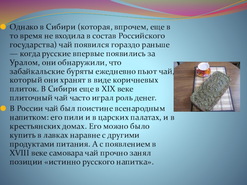 когда русские впервые появились за Уралом, они обнаружили, что забайкальские буряты ежедневно пьют чай, который они хранят в виде коричневых плиток. В Сибири еще в XIX веке плиточный чай часто играл роль денег.