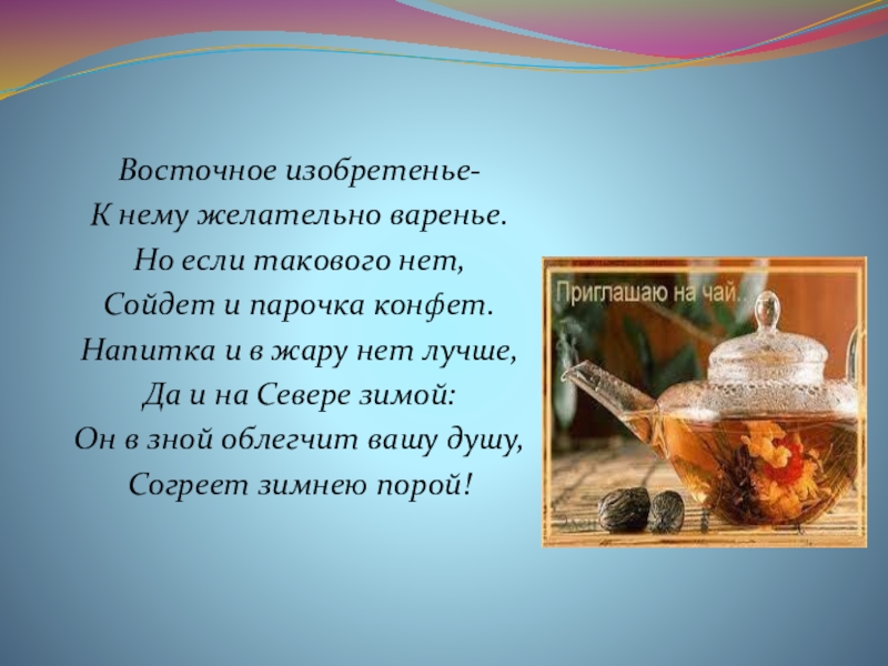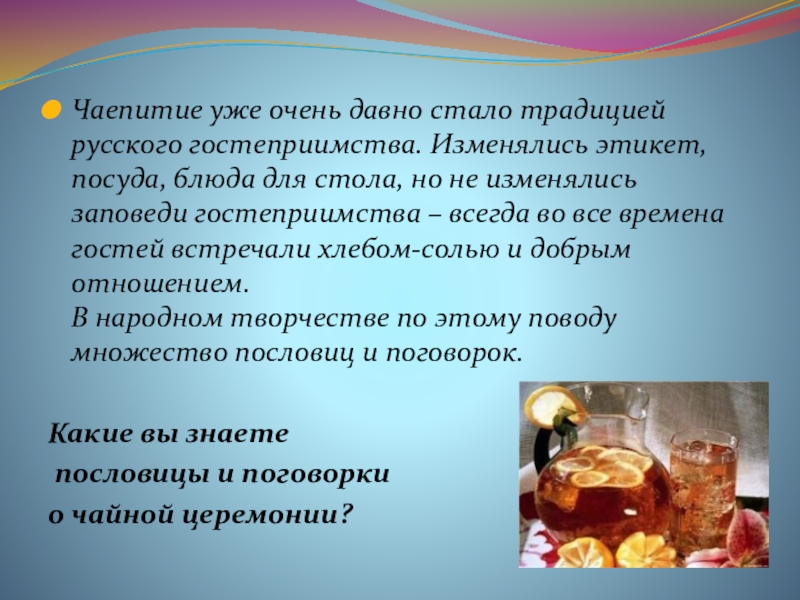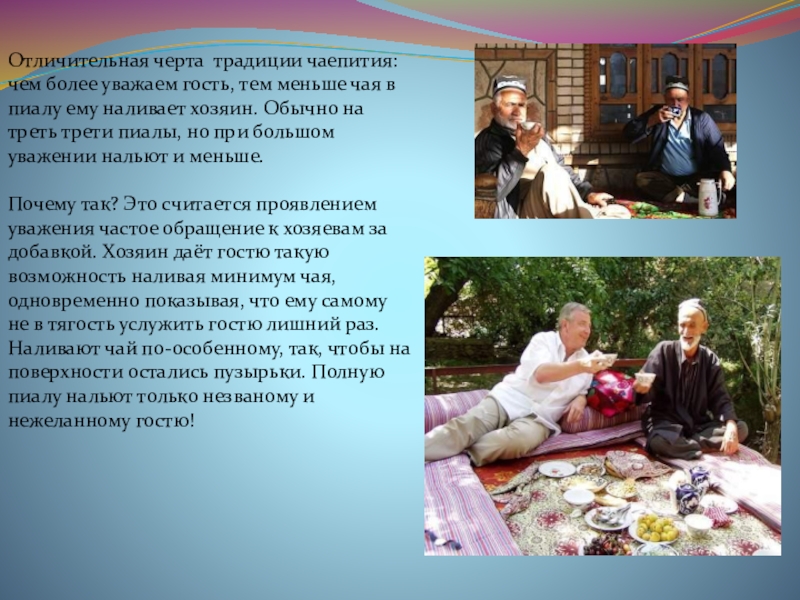 Слайд 29Отличительная черта традиции чаепития: чем более уважаем гость, тем меньше