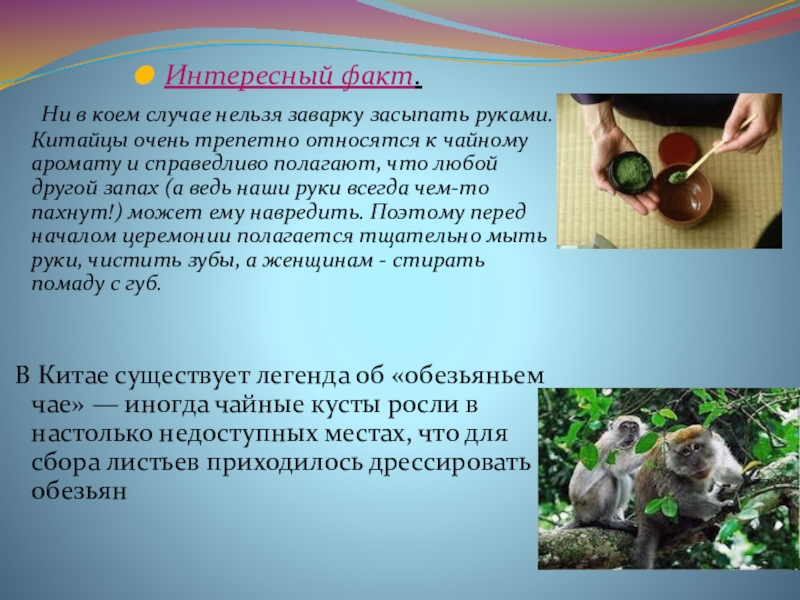 В Китае существует легенда об «обезьяньем чае» — иногда чайные кусты росли в настолько недоступных местах, что для сбора листьев приходилось дрессировать обезьян