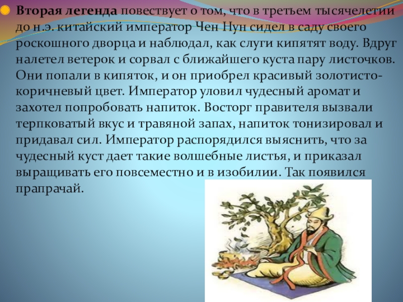 дворца и наблюдал, как слуги кипятят воду. Вдруг налетел ветерок и сорвал с ближайшего куста пару листочков. Они попали в кипяток, и он приобрел красивый золотисто-коричневый цвет. Император уловил чудесный аромат и захотел попробовать напиток. Восторг правителя вызвали терпковатый вкус и травяной запах, напиток тонизировал и придавал сил. Император распорядился выяснить, что за чудесный куст дает такие волшебные листья, и приказал выращивать его повсеместно и в изобилии. Так появился прапрачай.