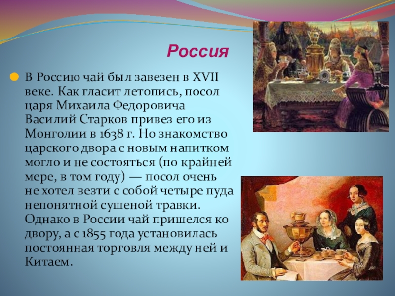 Монголии в 1638 г. Но знакомство царского двора с новым напитком могло и не состояться (по крайней мере, в том году) — посол очень не хотел везти с собой четыре пуда непонятной сушеной травки. Однако в России чай пришелся ко двору, а с 1855 года установилась постоянная торговля между ней и Китаем.