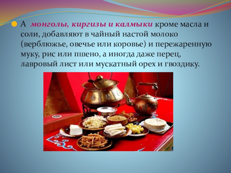 Слайд 27А монголы, киргизы и калмыки кроме масла и соли, добавляют
