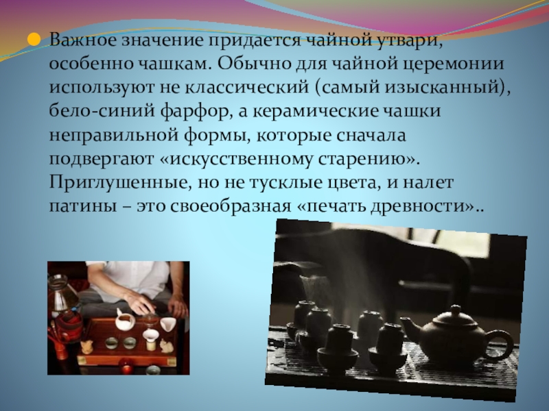 Слайд 16Важное значение придается чайной утвари, особенно чашкам. Обычно для чайной