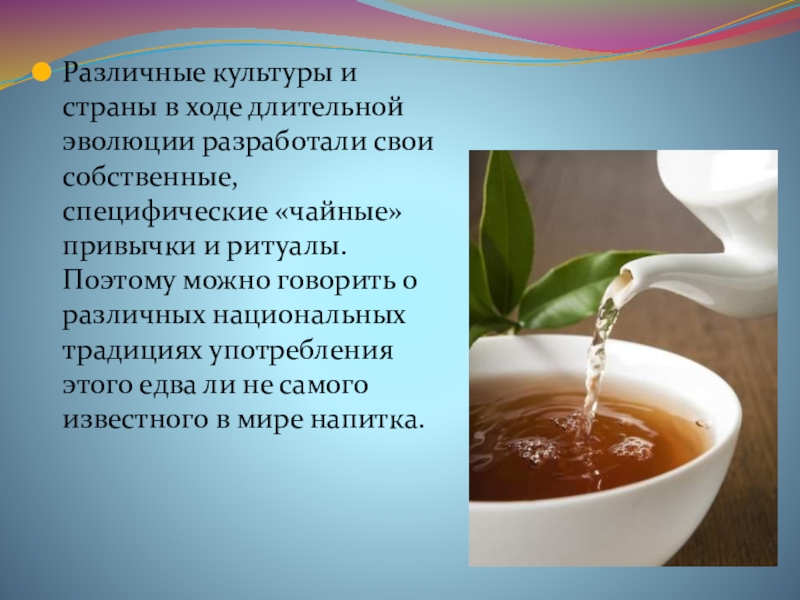 неотъемлемой частью различных культур. В каждом уголке планеты появились свои, индивидуальные чайные церемонии, присущие тому или иному народу.
