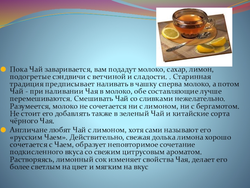 Англичане любят Чай с лимоном, хотя сами называют его «русским Чаем». Действительно, свежая долька лимона хорошо сочетается с Чаем, образует неповторимое сочетание подкисленного вкуса со свежим цитрусовым ароматом. Растворяясь, лимонный сок изменяет свойства Чая, делает его более светлым на цвет и мягким на вкус