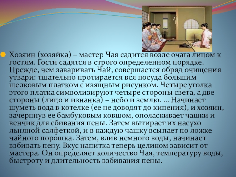Слайд 17Хозяин (хозяйка) – мастер Чая садится возле очага лицом к