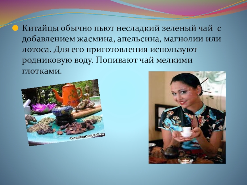 Слайд 12Китайцы обычно пьют несладкий зеленый чай с добавлением жасмина, апельсина,