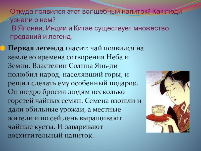 Слайд 2Откуда появился этот волшебный напиток? Как люди узнали о нем?