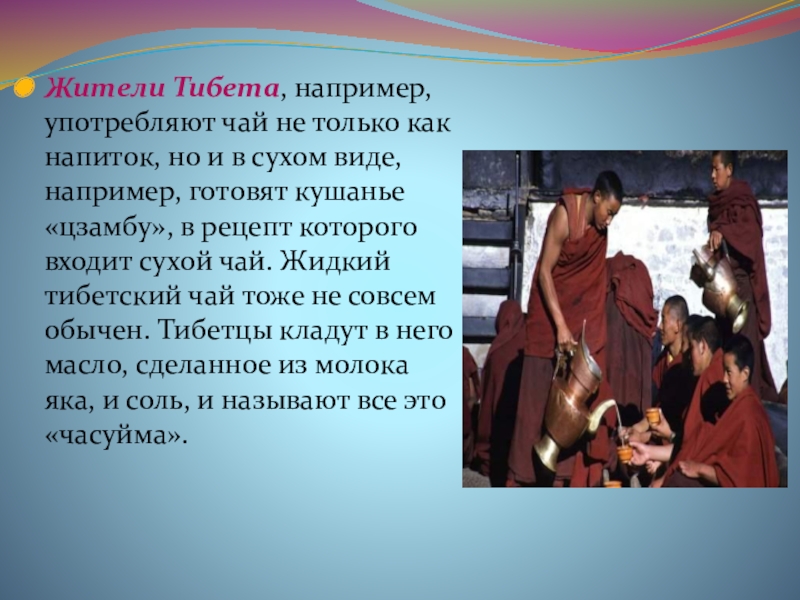 Жители Тибета, например, употребляют чай не только как напиток, но