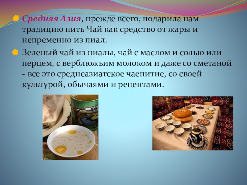 Слайд 28Средняя Азия, прежде всего, подарила нам традицию пить Чай как