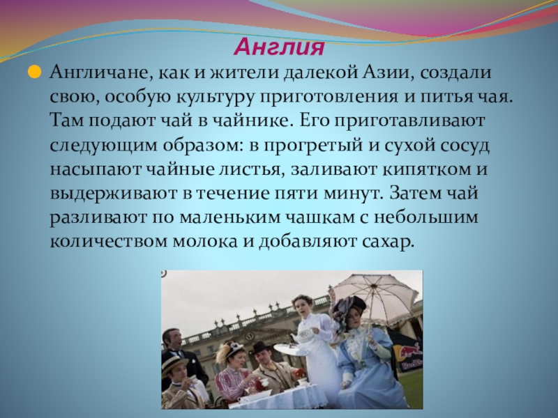 Англии, торжественных церемониях распития зеленого чая в Японии и Китае,