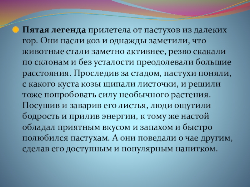 скакали по склонам и без усталости преодолевали большие расстояния. Проследив за стадом, пастухи поняли, с какого куста козы щипали листочки, и решили тоже попробовать силу необычного растения. Посушив и заварив его листья, люди ощутили бодрость и прилив энергии, к тому же настой обладал приятным вкусом и запахом и быстро полюбился пастухам. А они поведали о чае другим, сделав его доступным и популярным напитком.