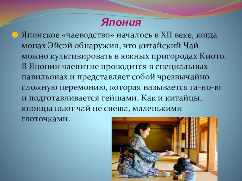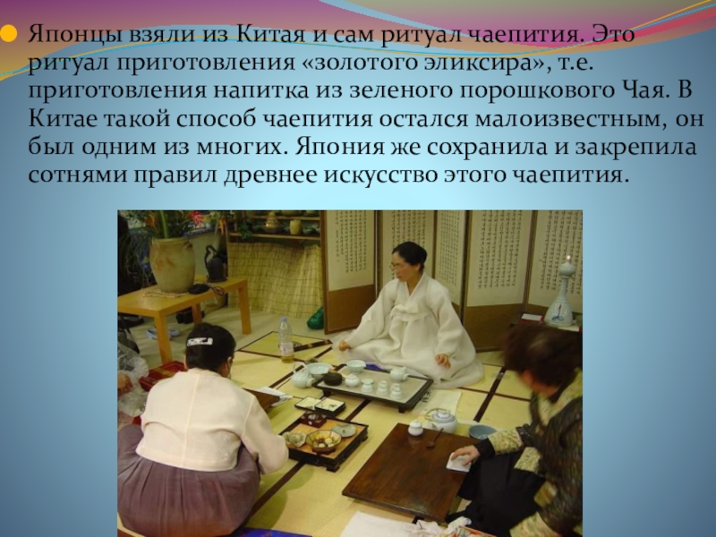 Слайд 15Японцы взяли из Китая и сам ритуал чаепития. Это ритуал