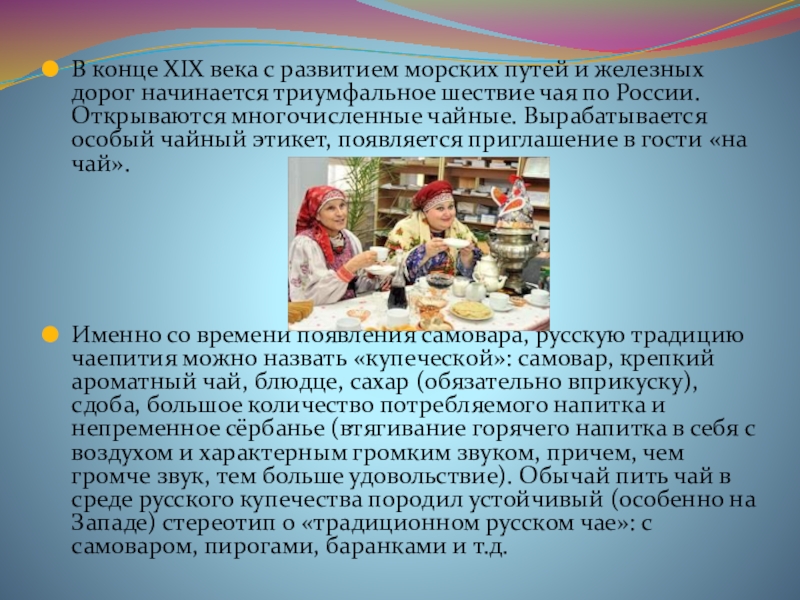 Именно со времени появления самовара, русскую традицию чаепития можно назвать «купеческой»: самовар, крепкий ароматный чай, блюдце, сахар (обязательно вприкуску), сдоба, большое количество потребляемого напитка и непременное сёрбанье (втягивание горячего напитка в себя с воздухом и характерным громким звуком, причем, чем громче звук, тем больше удовольствие). Обычай пить чай в среде русского купечества породил устойчивый (особенно на Западе) стереотип о «традиционном русском чае»: с самоваром, пирогами, баранками и т.д.
