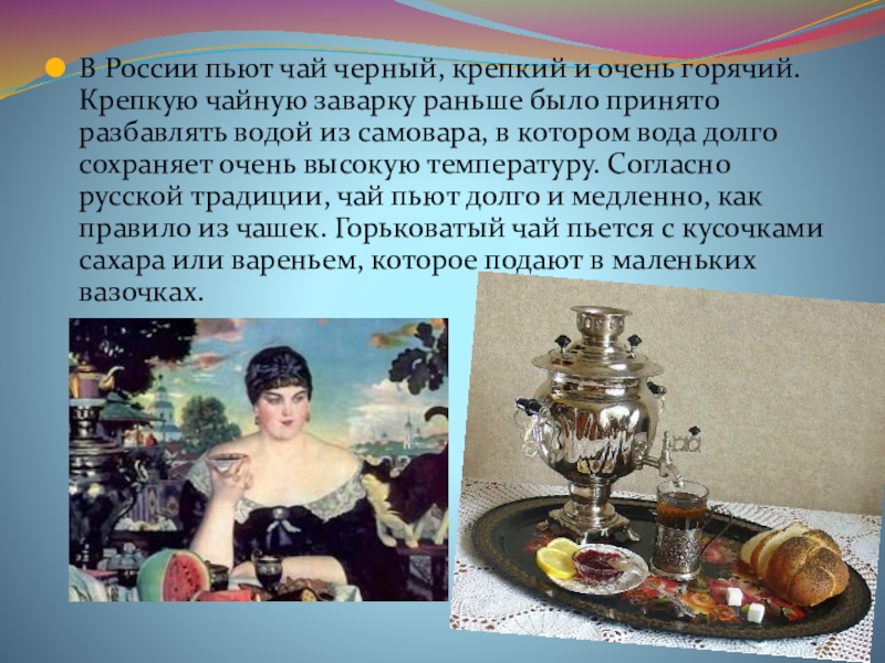 Слайд 23В России пьют чай черный, крепкий и очень горячий. Крепкую