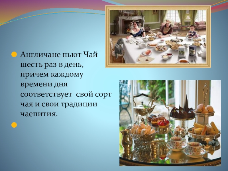 Слайд 20Англичане пьют Чай шесть раз в день, причем каждому времени